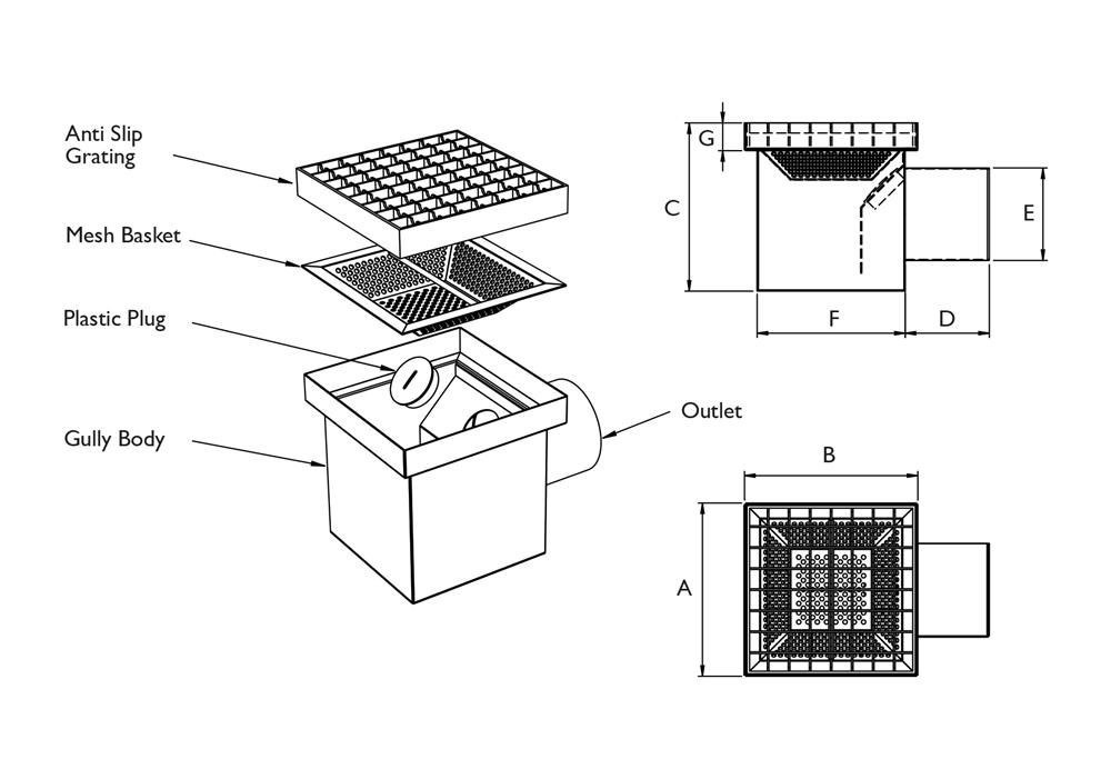 يمكن تعديل ارتفاع الأخاديد لتسهيل التركيب وتحتوي على حواجز شبيكة قابلة للإزالة ومانعات مرور الروائح وأماكن التنظيف باستخدام الأنابيب وحاويات القمامة ما يتيج الوصول الكامل. وتكون الفتحات عمودية أو أفقية.